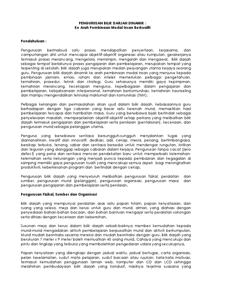 Pengurusan pembelajaran Bilik Darjah. Sebagai pembelajaran untuk pembelajaran dan tentang pembelajaran. Pengurusan bilik darjah komponen penting dalam latihan perguruan kerana murid tidak boleh belajar tanpa ketertiban dalam bilik darjah.